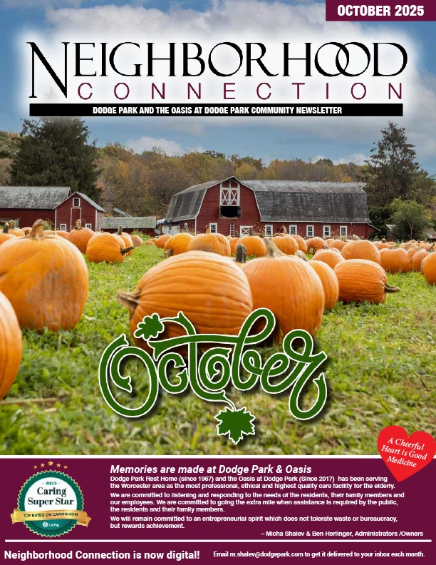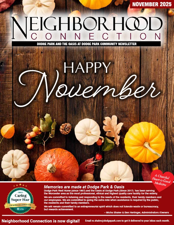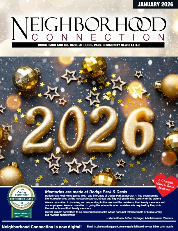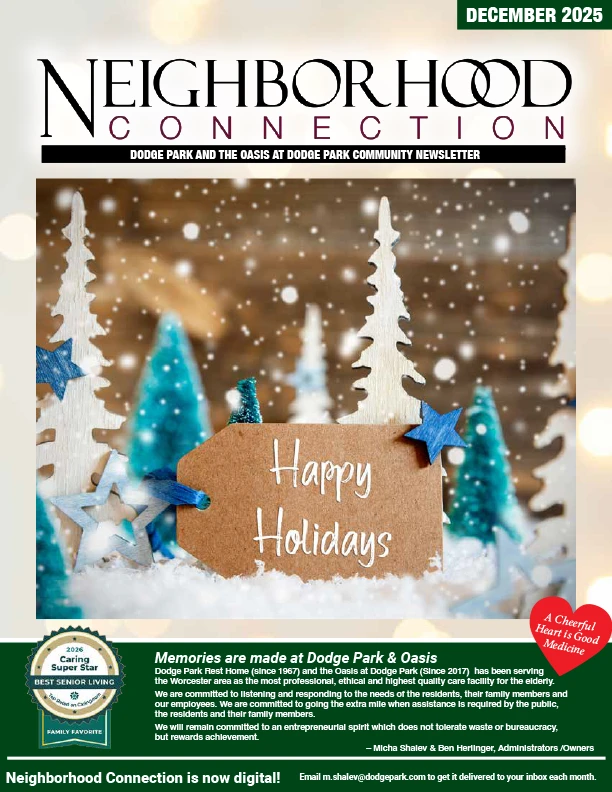 The Dodge Park Neighborhood Connection is an email newsletter. The newsletter is emailed out to the community each month. It highlights health and lifestyle articles, Worcester information and Dodge Park events. You can see photos of outings and activities at Dodge Park Rest Home and Day Club. It includes our monthly activity calendar and our Support Group meeting dates. You can also get to know one of Dodge Park’s fantastic employees each month. You can download it from our website or get it emailed directly to you each month.
