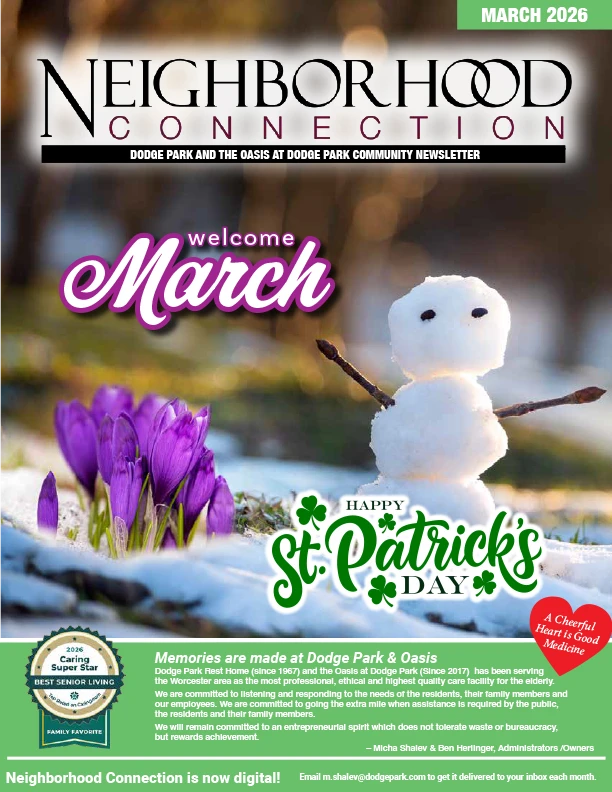 The Dodge Park Neighborhood Connection is an email newsletter. The newsletter is emailed out to the community each month. It highlights health and lifestyle articles, Worcester information and Dodge Park events. You can see photos of outings and activities at Dodge Park Rest Home and Day Club. It includes our monthly activity calendar and our Support Group meeting dates. You can also get to know one of Dodge Park’s fantastic employees each month. You can download it from our website or get it emailed directly to you each month.