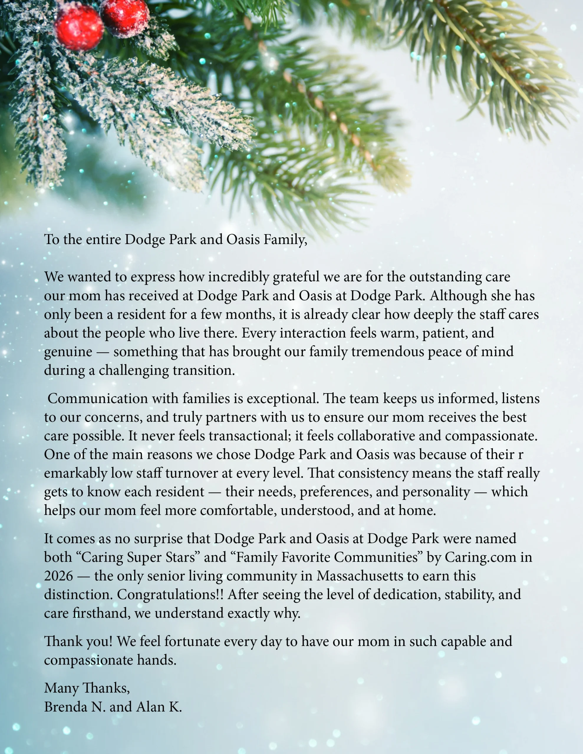 Dodge Park has been recognized by Caring.com in the category of Residential Care and Memory Care. Dodge Park truly stands out as among the top senior living communities in the country.